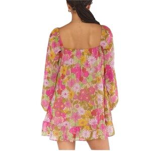 Vibrant floral mini dress with pink and yellow hues. Features long sleeves and a square neckline.