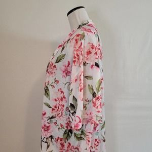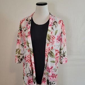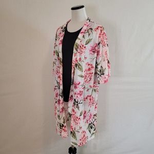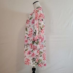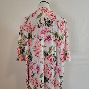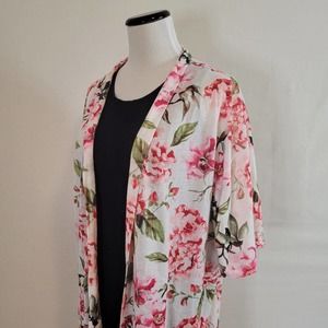 Features: Open front, loose fit, pink floral over white background, half sleeve, some stretch, soft, long length, loose