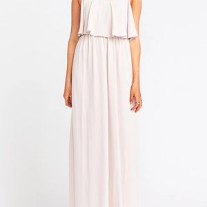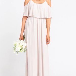 Show Me Your MuMu Caitlin Ruffle Maxi Dress in size medium. Dress color is "show me the ring crisp" (it's a light champagne color). Only alteration was hemming about 1 inch shorter. I'm 5'8" and hemmed to fit me wearing 2" heels. I only wore once as a bridesmaid in a wedding. Can be worn with or without the "cold shoulder" (see first and second pics).