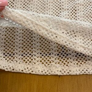 Show me your Mumu new bathing suit cover up. It is made of polyester and elastane with a crocheted look that has a bit of stretch. The size tag is not on it. I am a 10–12 and I think a M-XL would fit it best depending on how loose you would like it to be. I do have measurements in the pictures. Thank you for considering my item.🌻