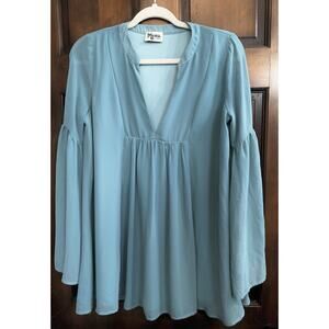 The Dakota Willow Swing Dress by Show Me Your MuMu in Blue Green Aqua is a stylish and versatile option for various occasions, from casual outings to workwear and parties. This V-neck dress features long bell sleeves and a pullover closure for easy wear. Made from lightweight chiffon material, this short dress is perfect for all seasons and can be cared for with a dry clean or hand wash. The dress is lined for added comfort and is suitable for sizes small and up. Perfect for showing off your favorite MuMu style.