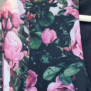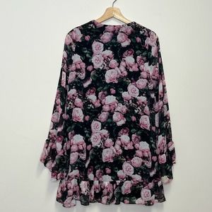 Show Me Your Mumu Diana Rose Shook tunic. Semi-sheer, very oversized with a v-neck and long sleeves. End of sleeves and bottom of top feature a full ruffle. The tunic is lightly lined and is made of soft flowing chiffon like material. There are some thread lines in the fabric that are hard to see because of the pattern - see photos for details. I am not sure if it is part of the print or from thread loss but please see pictures. Price reflects what I consider a flaw.