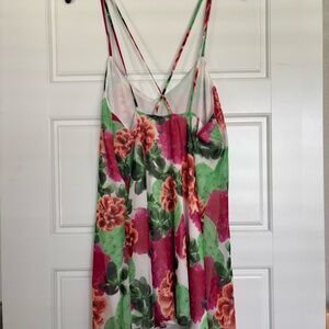 Vibrant mini dress with floral and cactus print. Features shades of red, green, and orange. Perfect for a fun, casual look.