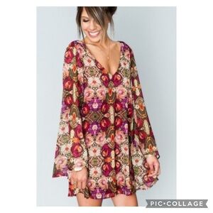 Swingy low back vibrant multicolored floral print bell sleeve chiffon dress.