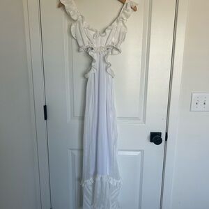 Chic white maxi dress with ruffle details. Perfect for any occasion. Flattering and stylish.