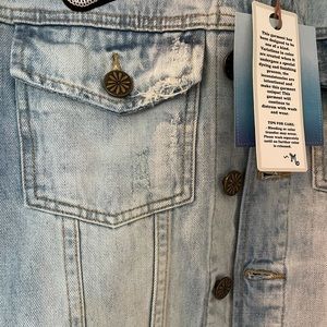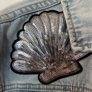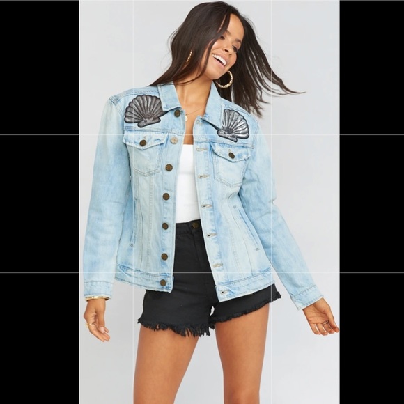Stylish light blue jean jacket. Features black shell accents on shoulders. Button-up front. Perfect for casual outings.