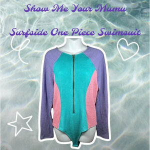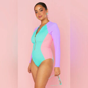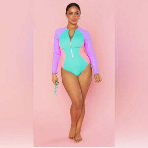 Long sleeve swimsuit with zipper front. Vibrant mint and lavender colors. Perfect for a stylish swim.
