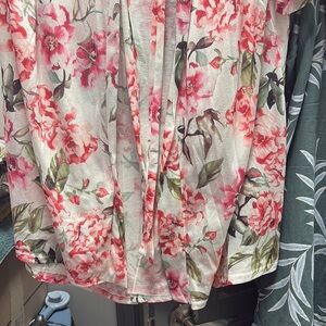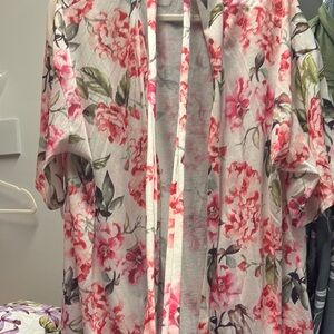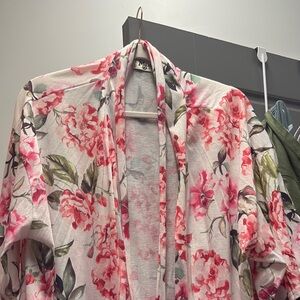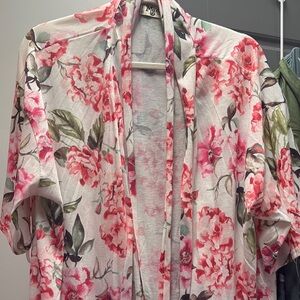 Chic kimono with vibrant floral design. Features pink blossoms and green leaves. Ideal for stylish layering. Clean, smoke free, no flaws, ready to ship same business day.