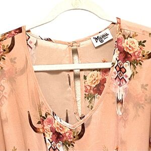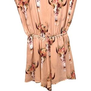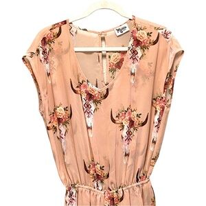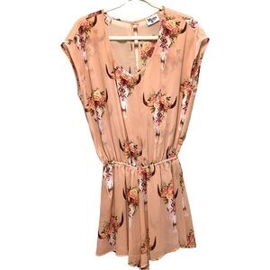 Chic pink romper with floral print. Short sleeves and relaxed fit. Perfect for casual outings.