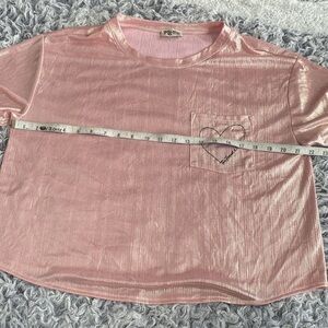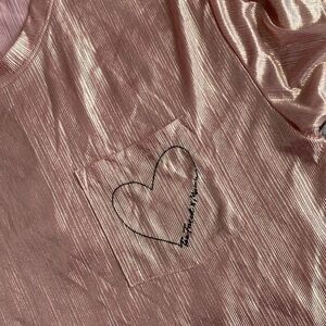 Chic pink short sleeve tee. Features a subtle heart design. Perfect for casual outings.