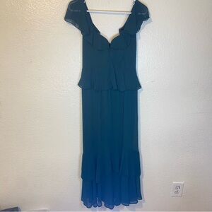 Elegant teal maxi dress with ruffled details. Sleeveless design with a flattering fit. Perfect for special occasions.