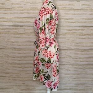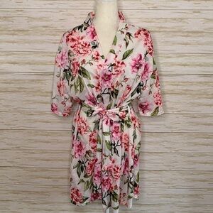 Show Me Your Mumu short robe. Feels like tee shirt knit but is is 100% polyester. Pink and green floral print. Tie belt. One size fits all. Great used condition.
