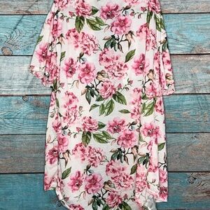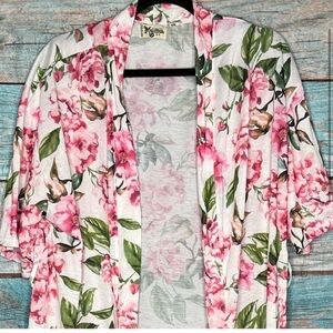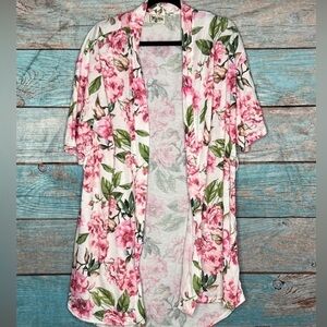 SMYM Brie robe. One size. Floral garden of blooms. Silky feel. Very pretty. Feminine. Barbie pink color. Tie sash belt. Preloved. Please see all photos for condition.