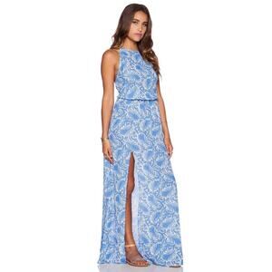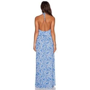 The Show Me Your MuMu Heather maxi dress features a high neckline, a low, low back, a cinched waist, and a flattering side slit. Ties at neck. Color name is sea breeze blue. Polyester. Dry clean. New with tags.
