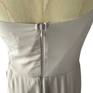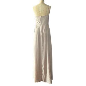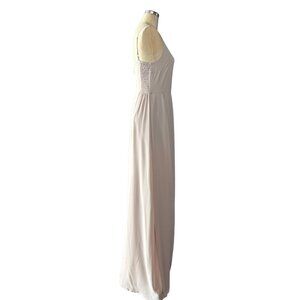 This stunning sleeveless gown features an asymmetrical one-shoulder neckline, perfect for wedding guests or cocktail events. Crafted in a soft cream color, the dress flows elegantly to the floor, offering a sophisticated and stylish silhouette.