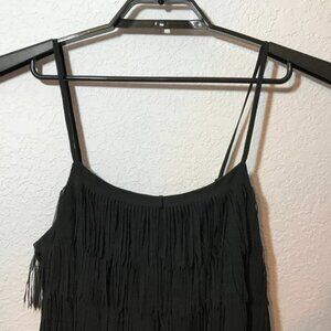 Show Me Your MuMu Tia black top with ChaCha Fringe. This tank moves and flows with your every move, perfect for dancing. Fits true to size. Adjustable spaghetti straps. Slips on over the head. Fully lined. Size Small. Length 21", Chest 18" lying flat. 100% Polyester. Hand wash or dry clean.