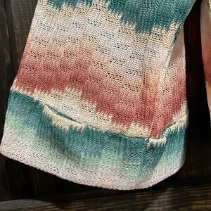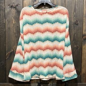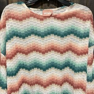 Show Me Your MuMu brand daytime pullover. Size large. Catch Waves colorful stripes. White / Pink / Blue. Bell sleeves. Hippie vibes. Light sweater, great for Spring & Summer. Wear as a top or as a layering piece / swim cover. Preloved. Please see all photos for condition.
