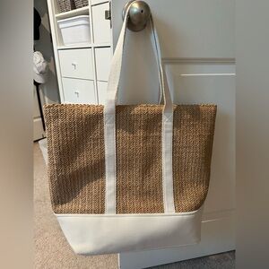 Discover the perfect blend of style and practicality with the Show Me Your MuMu Tan and White Tote Bag. This spacious tote features a chic two-tone design with a natural woven texture and crisp white accents, making it ideal for beach outings or casual summer days.