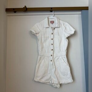 Stylish white denim romper with button-up front and short sleeves. Features pockets and an elastic waist for comfort.