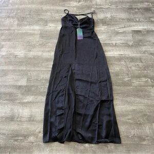 A satiny gown with adjustable straps combines a low-cut cowl neckline with an Empire waist and a thigh-high front slit to make a seductive and shimmering statement.
