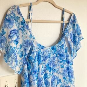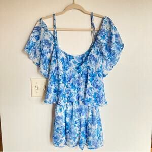 Show Me Your MuMu Womens S Quinn Blue Floral Ruffled Cold Shoulder Romper Boho