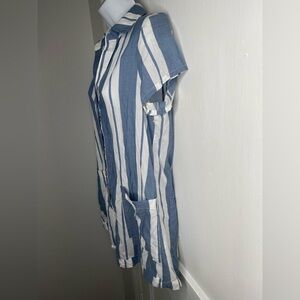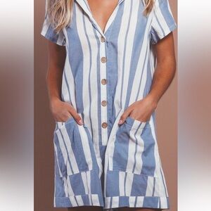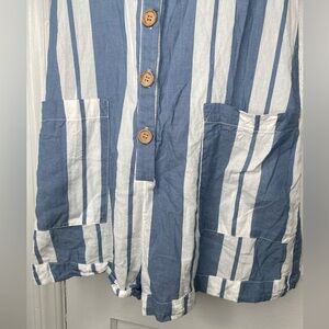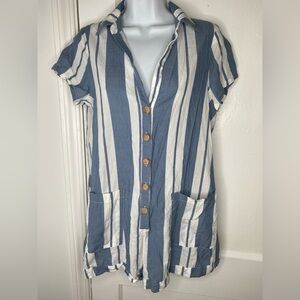 This casual romper by Show Me Your MuMu features a playful blue and white stripe pattern, perfect for resort wear. Designed with a notched collar and short sleeves, it offers a relaxed fit ideal for sunny days.