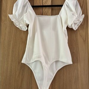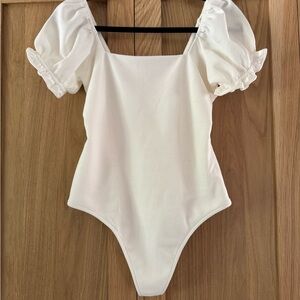 Charming white bodysuit with puff sleeves. Soft and stylish. New with tags but has some dust on the front, back, and sleeve as shown in pictures.