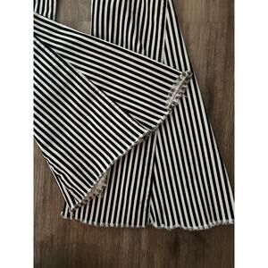 Allover stripe print, bell-bottom silhouette, frayed hems