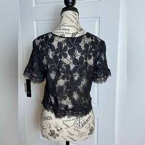 Keywords: Show Me Your Mumu top, black lace blouse, sheer crop top, floral lace shirt, festival fashion, boho chic, women’s size small, trendy going-out top.