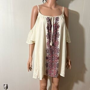 Channel effortless bohemian vibes with this Show Me Your Mumu Bonnaroo Dress in size Medium. This breezy mini dress features a relaxed fit, lightweight fabric, and an intricate patterned front panel that adds a bold pop of detail. Designed with cold-shoulder sleeves and delicate straps, it’s the perfect blend of flirty and free-spirited. Pair it with sandals for a summer outing, or style with boots and a hat for the ultimate festival look.