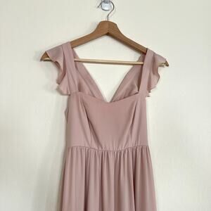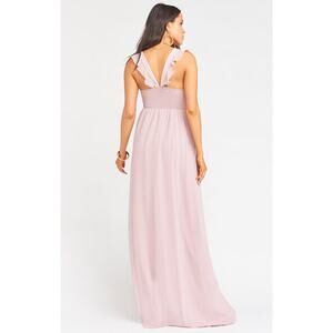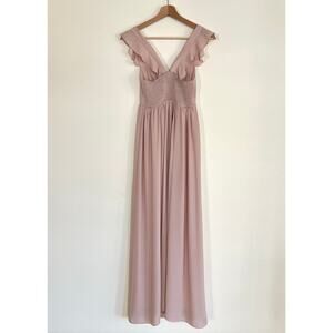 Keywords: bridesmaid dress, mauve maxi, formal dress, wedding guest, chiffon gown, Show Me Your Mumu, dusty rose, ruffle strap dress, elegant evening wear, neutral blush dress