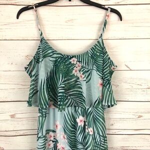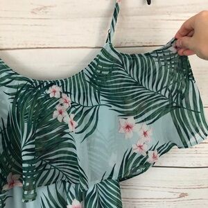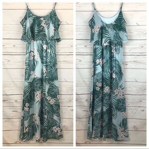 The Caitlin Ruffle Maxi flutters and flows from top to bottom. She's extremely versatile, wear as a classic spaghetti strap or a cold shoulder. Hanalei Dream tropical palm tree floral print with a sage green background. Perfect for resorts, or bridesmaids. Chiffon 100% Polyester, Lined to the ground, Adjustable straps. Wear ruffle over your shoulders or take arms out for a simple silhouette. Strapless bra friendly. Hidden elastic waist. No flaws to note.