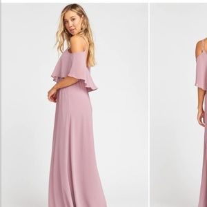 Beautiful chiffon floor length dress! Cold shoulder ruffle detail that is very unique. Worn once for a wedding as a bridesmaid, super comfortable! Dress has been altered for length, I am 5’ 4” and wore 2.5 inch heels - the dress grazed the ground.