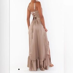 Show Me Your Mumu Clarissa Corset Dress. Color: Dune luxe satin. Get swept away by romance in the Clarissa Corset Dress. Beautiful tiers of luxe satin fall to a maxi hem with side slit, topped with a figure flattering corset bodice! Let her be the statement of your look paired with dainty jewelry and barely there heels. Purchased off of Poshmark. Previous owner only wore it once for a wedding. Worn once for a wedding and hemmed to fit my height (5’2.5”) in 4.75” heels. Dress has been dry cleaned, in plastic bag, stain and wrinkle free. Small snag on backside of dress as shown in photos. In excellent condition. Originally $228 before shipping and tax.