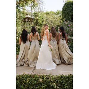 Beautiful tiers of luxe satin fall to a maxi hem with side slit, topped with a figure flattering corset bodice! Let her be the statement of your look paired with dainty jewelry and barely there heels.