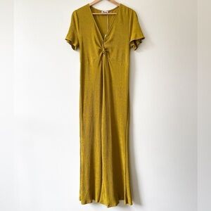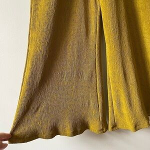 Gorgeous lightweight bohemian feel jumpsuit in an avocado green color. Fabric is textured and stretchy. (Fabric content tag not present.) elastic waistband. Twisted gathered v-neck with hook and clasp closure. Flowy wide legs.
