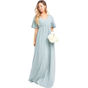 Show Me Your Mumu Emily Empire Maxi Dress in Silver Sage Crisp, Size Medium. Perfect for wedding guests, bridesmaids, summer cruises, pictures or any event where you want to be stunning! Brand new still in manufacturers packaging.