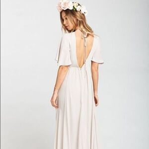 The Faye Flutter Maxi has a longer flouncy sleeve and low neckline meeting at an empire waist so you can't be anything but gorge. A tie at the back shoulder ensures you're tucked in for the night, while an open back gives a touch of skin. For our gals with a bigger chest, consider sizing up and adding a hook and eye. 100% Polyester Lined as a mini dress Double slit Zipper closure in back of skirt Ties at the nape of the neck Colors may photograph differently under studio lighting BM7-00065 SR46Size: Womens S Dress was purchased from SMYM through liquidation and is authentic, unaltered, unworn, and new (with or without tags) unless otherwise indicated above. May arrive wrinkled and need steaming prior to event. Pet free and smoke free environment. Shipped daily Monday-Saturday from Washington State. Keywords: Wedding, Bride, Bridesmaid, Bridal, Prom, Formal