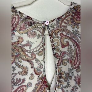 White chiffon with pink/red/tan/blue in a beautifully whimsical paisley/floral pattern. Sheer back, sleeves, and bottom leg ruffles. Boho bell bottom long-sleeves. Keyhole back opening with button closure Elastic waist. Hand wash, line dry. 100% polyester