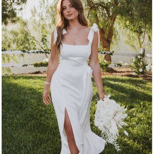 Description: This tie strap white midi dress is filled with charm! Similar to our bestselling claire midi but with adjustable tie straps. A fitted bodice complete with smocking for the perfect fit meets a fun midi skirt with side slit. An effortless midi dress for all your bridal events!
