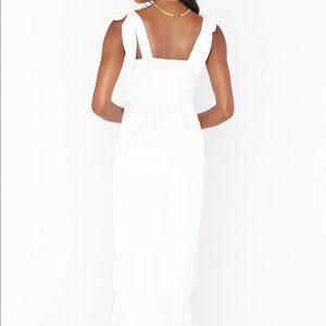 Show Me Your Mumu Garden Ruffle Midi Dress in White Ivory Luxe Satin