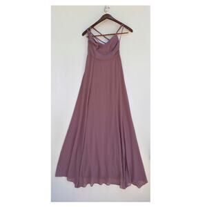 Features: a lace up bodice punctuated with a skirt fitted to flatter but with a sweep to turn heads. A classic silhouette with a Mumu modern flare. Lined to the ground, criss cross straps, no slits, purple, plum, strappy, zipper closure, slight v neck, SMYM wedding, formal, bridesmaid, guest.