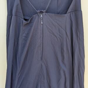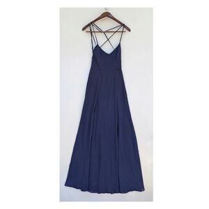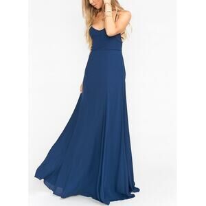 Features: a lace up bodice punctuated with a skirt fitted to flatter but with a sweep to turn heads. A classic silhouette with a Mumu modern flare. Lined to the ground, criss cross straps, no slits, navy blue, strappy, zipper closure, slight v neck, SMYM wedding, formal, bridesmaid, guest.