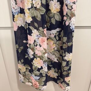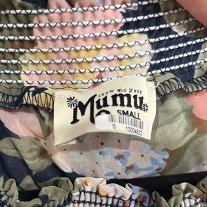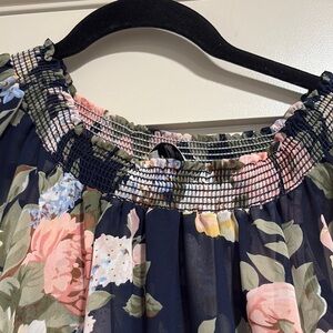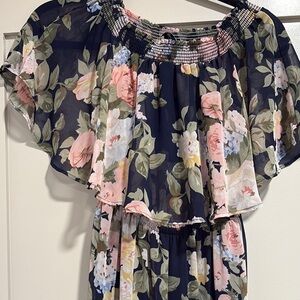 Elegant Show Me Your Mumu Hacienda Maxi Dress in Party Blossom print. This flowy, off-the-shoulder maxi dress features a charming floral pattern with soft pink, yellow, and green blooms against a dark background. Perfect for spring events, garden parties, or a stylish casual look. Excellent pre-owned condition.
