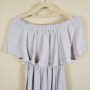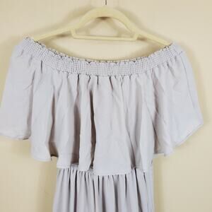 New with tags has stain in front. Size small. Color Show Me The Ring Crisp. The Hacienda Maxi's versatile ruffle top has an elastic neckline to wear off the shoulder, strapless, and one shoulder. Cinches at the waist with elastic to flatter no matter which shoulder her ruffle sits on.
