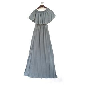 Features: a versatile ruffle top with an elastic neckline to wear off the shoulder, strapless, and one shoulder. Cinches at the waist with elastic to flatter no matter which shoulder her ruffle sits on. Chiffon fabric, flowy, lined, double slit, strapless bra friendly, maternity friendly, SMYM, wedding, formal, bridesmaid
