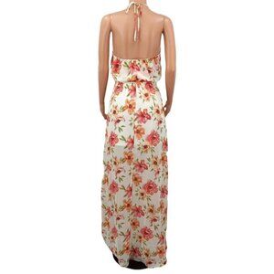 Show Me Your Mumu Heather Halter Maxi Dress In Pink Poppi Women’s Cream & Pink Bridesmaid Wedding Guest Formal Tie Neck Open Back Side Slit Chiffon Floor Length Elastic Waist Partially Lined Lightweight Chic Boho Festival Hippie Casual Spring Summer Beach Vacation Party Cocktail Night Out.