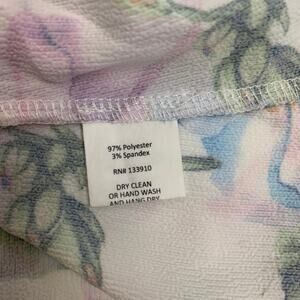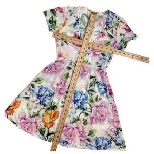 V neckline. Empire waist. Triangle cutout in the back. Flowy silhouette. ‘Floral Burst’ print with roses and hydrangeas. Side zip. EUC, no flaws or signs of wear. Size XS. See photos for details and measurements.