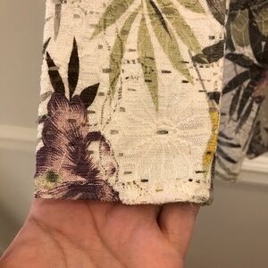 All over Hawaiian palm and hibiscus print in green, purple, yellow, and off white.