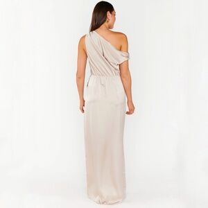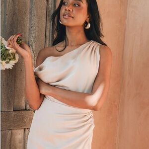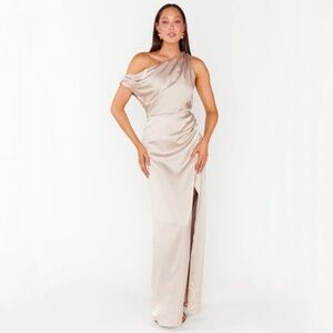 Chic and sophisticated in the Jodie Dress. An elegant asymmetrical silhouette crafted in luxe satin with a draped neckline and sultry side slit. Styled with dainty heels and minimal jewelry make the perfect event attire.